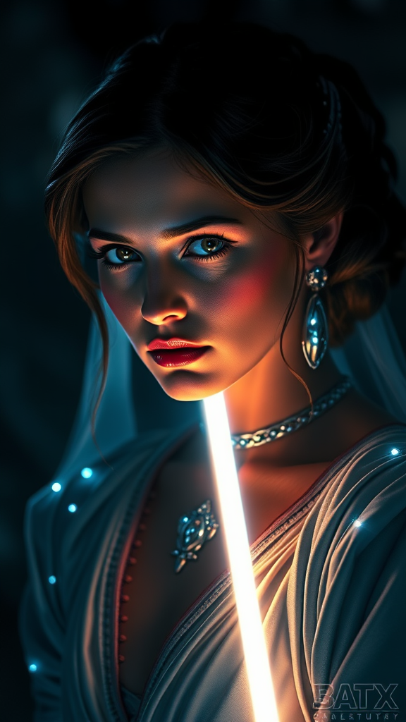 Masterpiece depicting a stunning Princess Leia enveloped in a nightly glow, intricately detailed with silver features, exuding a radiant beam within a dark fantasy setting. Inspired by the artistry of Luis Royo, this piece is crafted in a studio portrait style with a cyberpunk twist. Captured in 8K, UHD, HDR, this creation avoids low resolution, out-of-frame elements, and distractions such as blurry effects, jpeg artifacts, watermarks, logos, or text overlays, ensuring a seamless and immersive visual narrative.