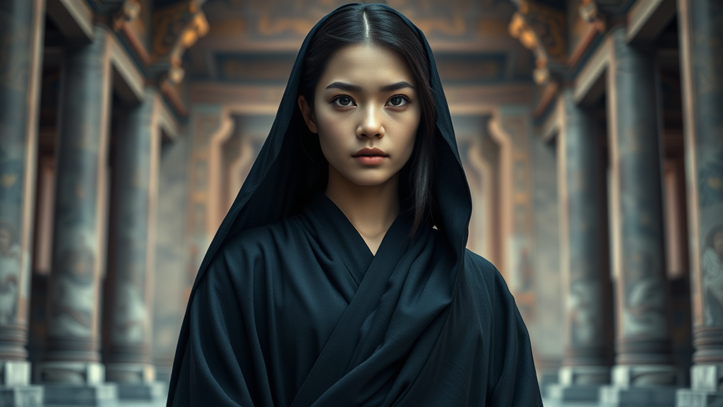 A young woman clad in dark, flowing robes with a serene expression stands in a majestic temple setting. Her eyes, perfectly symmetrical, reflect a calm intensity. The scene is illuminated by dramatic lighting that highlights her features with precision. Photographed in ultra-high definition, the image showcases hyperrealism with intricate details and sharp focus. Rendered with physics-based techniques, the depiction conjures the feeling of a high-detail RAW color photograph. The overall composition is designed to serve as a highly detailed 8K wallpaper, showcasing exceptional clarity and realism. The temple background, with its grand architecture, adds a sense of history and mystery to the scene. The focus remains on authenticity and capturing the essence of a realistic scenario, while avoiding digital artifacts or anatomical errors that could detract from the composition.
