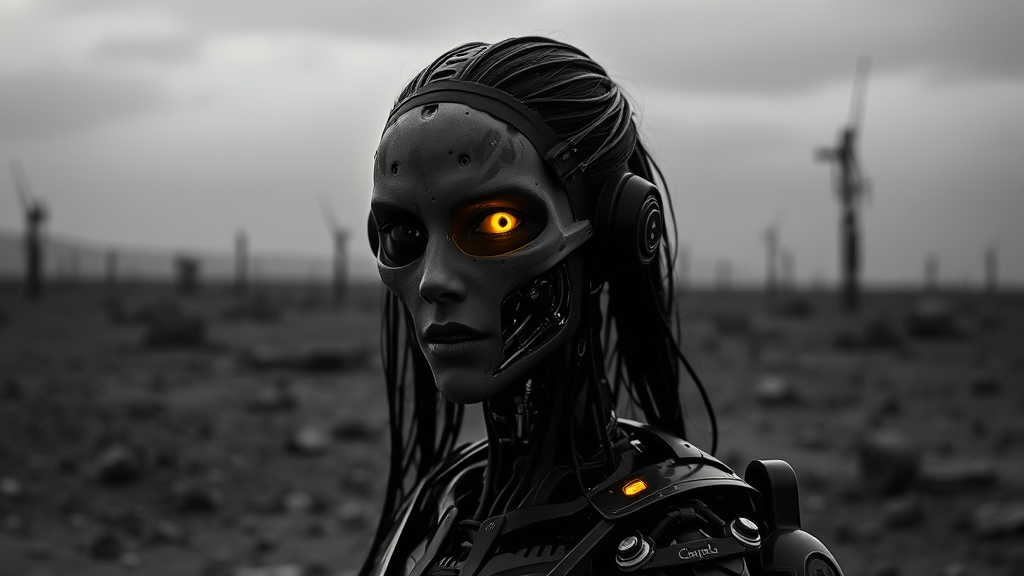 A captivating image depicting the enigmatic Terminator Girl, her robotic features partly concealed in shadow, standing resolute against a barren, dystopian setting. Her luminous yellow eye shines brightly in the darkness, offering a striking contrast to the somber surroundings. Utilizing a Canon L Series 70-200mm f/2.8 lens with ISO 1600, the photograph embraces a futuristic monochrome style, bringing out the intricate details of her cybernetic elements. The aspect ratio enhances her stature within the desolate landscape, creating a powerful visual narrative.