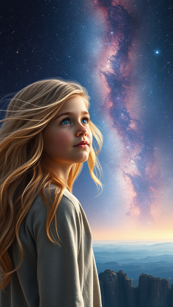A young girl with flowing blonde hair and striking blue eyes gazes into the vastness of space, surrounded by the ethereal glow of distant galaxies. Her expression is one of awe and wonder as she stands on the edge of a rocky cliff, blending seamlessly with the photo-realistic landscape that stretches out before her. The scene captures the intricate details of her features and the breathtaking celestial backdrop, where twinkling stars and luminous nebulae paint the sky. A gentle breeze ruffles her hair, adding a sense of movement and life to the moment.