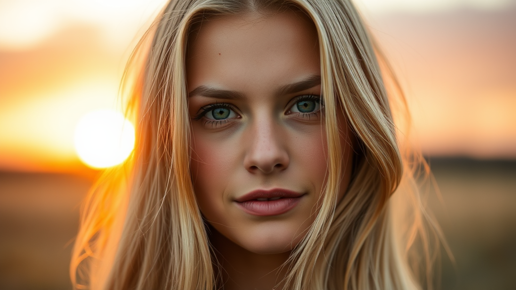 Photo realistic portrait of a stunning Scandinavian girl with medium blonde hair at sunset, featuring a detailed and intricate face. The lighting is sharp and focused, with a beautiful depth of field that highlights her symmetrical features. Shot using an f/1.8 aperture and 85mm lens on a Nikon Z9, the composition eliminates any blurriness or distortion. The portrait captures her natural beauty without any signs of bad anatomy, ensuring her limbs and features are perfectly proportioned and gracefully framed.
