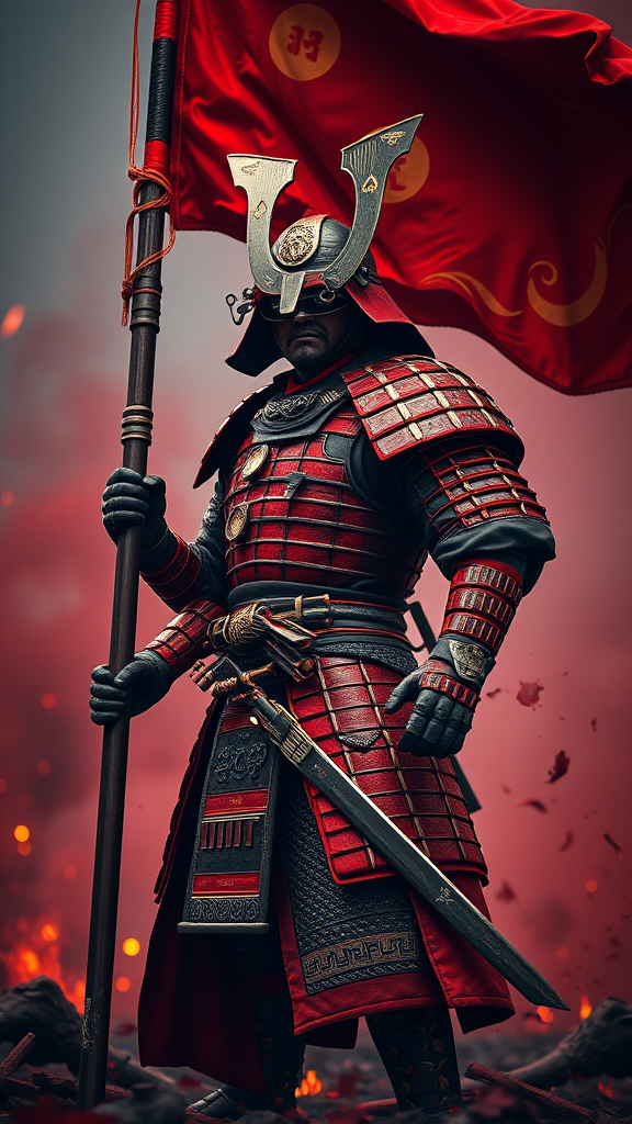 8k photography ultra-realistic samurai warrior holding a dynamic war flag, full body shot, featuring complex red and black armor with exquisite detailing, dramatic and ornate cinematic lighting, high-definition clarity, vibrant colors, popular on art platforms, hyperrealistic with meticulous details, focused sharpness, created in unreal engine 5, moody ambiance, deep depth of field, immersed in a red war-torn landscape filled with swirling smoke and glowing embers, subtle blur for cinematic effect, intense atmosphere -- ar 9:16
