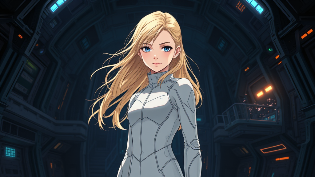 A young girl with flowing, sunlit blonde hair stands in a stark white, form-fitting sci-fi jumpsuit, embodying a Tsutomu Nihei-inspired anime art style. Her facial features are strikingly beautiful, with a cold, distant gaze that captures the essence of cyberpunk. Set against a dramatic, dark background within the intricate interior of a futuristic spaceship, the room feels cold and gloomy, filled with sharp angles and multi-level architecture. A blue lumen casts subtle hues over her, while a bright light illuminates her from one side, revealing an intricate array of small details. Her hair and the shadowy space dance in sharp contrasts, while clusters of energy pulse around her, casting fleeting flashes of light. The environment is replete with muted colors, and the blurred backdrop adds depth, emphasizing the hyper-detailed futuristic style, with dynamic, third-person perspective capturing her enigmatic presence amidst this vivid sci-fi landscape.