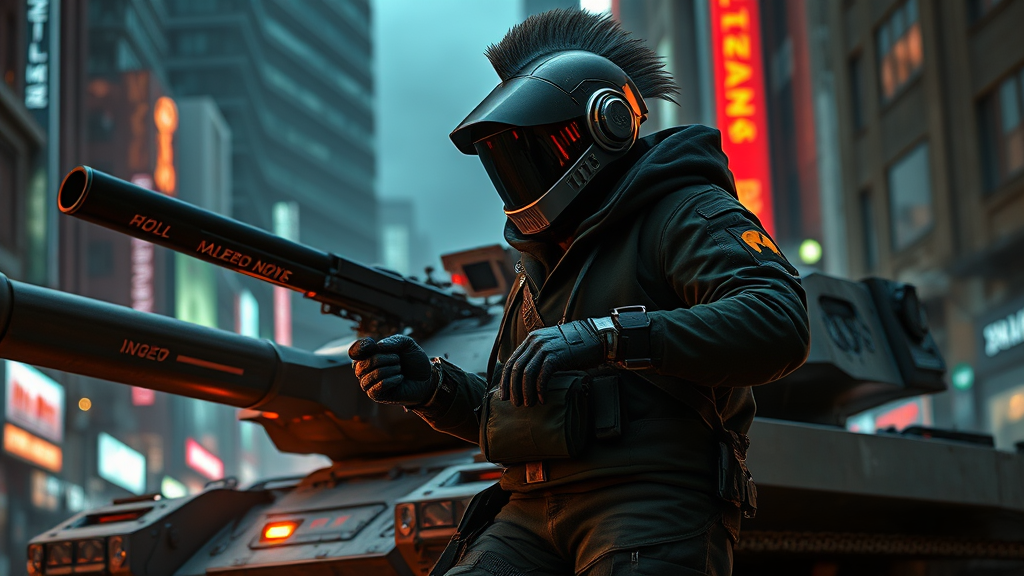 Masterpiece full-body shot, intricate raw photography. Cyberpunk, realistic, highly detailed 3D rendering, top quality, masterpiece, ultra-high-resolution. Cowboy-themed photo, photorealistic, raw photo, official art, close-up, complex background, surreal, atmospheric, ominous, tank, dynamic angle, advanced cyber helmet, mecha, robot, armor, mechanical arms, exo-suit, science fiction, no humans, worn asymmetric clothing. Tactical oversized black hoodie, advanced black visor helmet, HUD, modern ultra-realistic style, Daft Punk-inspired cyber helmet, black tactical gloves, sleek techwear cargo pants, futuristic clothing, mohawk, punk, rebel, punk-rock, cinematic, sci-fi scene, synthwave, twilight, dark, intricate, futuristic, sharp, precise focus, aggressive stance, high-tech gadgets, vibrant colors, intense, cyberpunk metropolis, street neon glows, Insta-worthy photo, Photo of the Year, cinema4d, dramatic, interplay of lights and shadows, realistic visual effects, Octane render, supreme-quality photorealistic image.