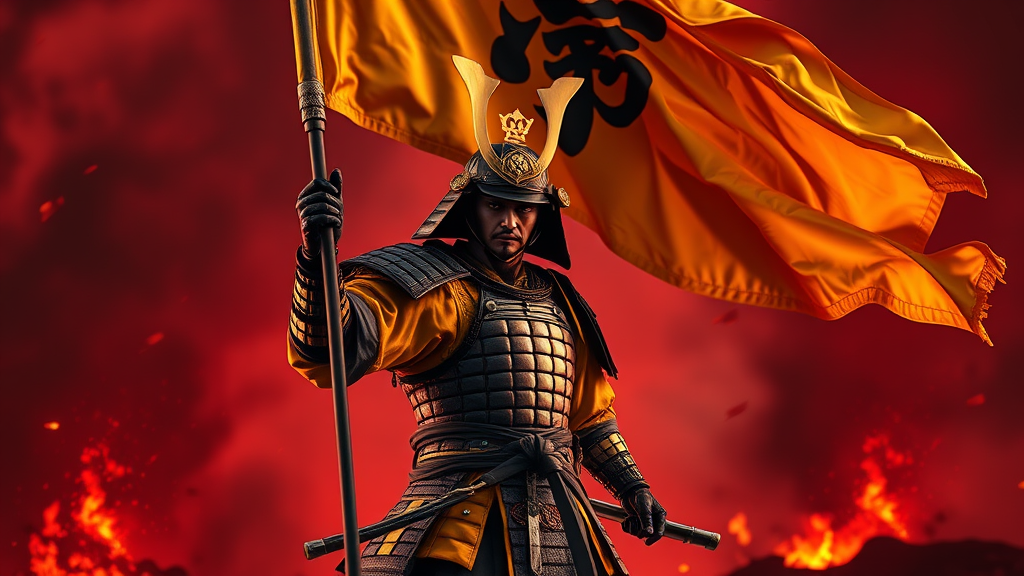 Portrait of 8k ultra-realistic samurai warrior holding a golden war flag waving dramatically in the wind, showcasing the full body length, adorned in complex yellow and obsidian black armor with delicate embellishments, illuminated by cinematic, high-definition lighting that accentuates the vibrant details, featured on trending art platforms, hyper-realistic with intense attention to detail, operating within an Unreal Engine 5 setting. The backdrop is a somber, reddish landscape marred by warfare, engulfed in swirling smoke and glowing embers, featuring deep lumen reflections and an impressive depth of field akin to professional photography --ar 9:16.