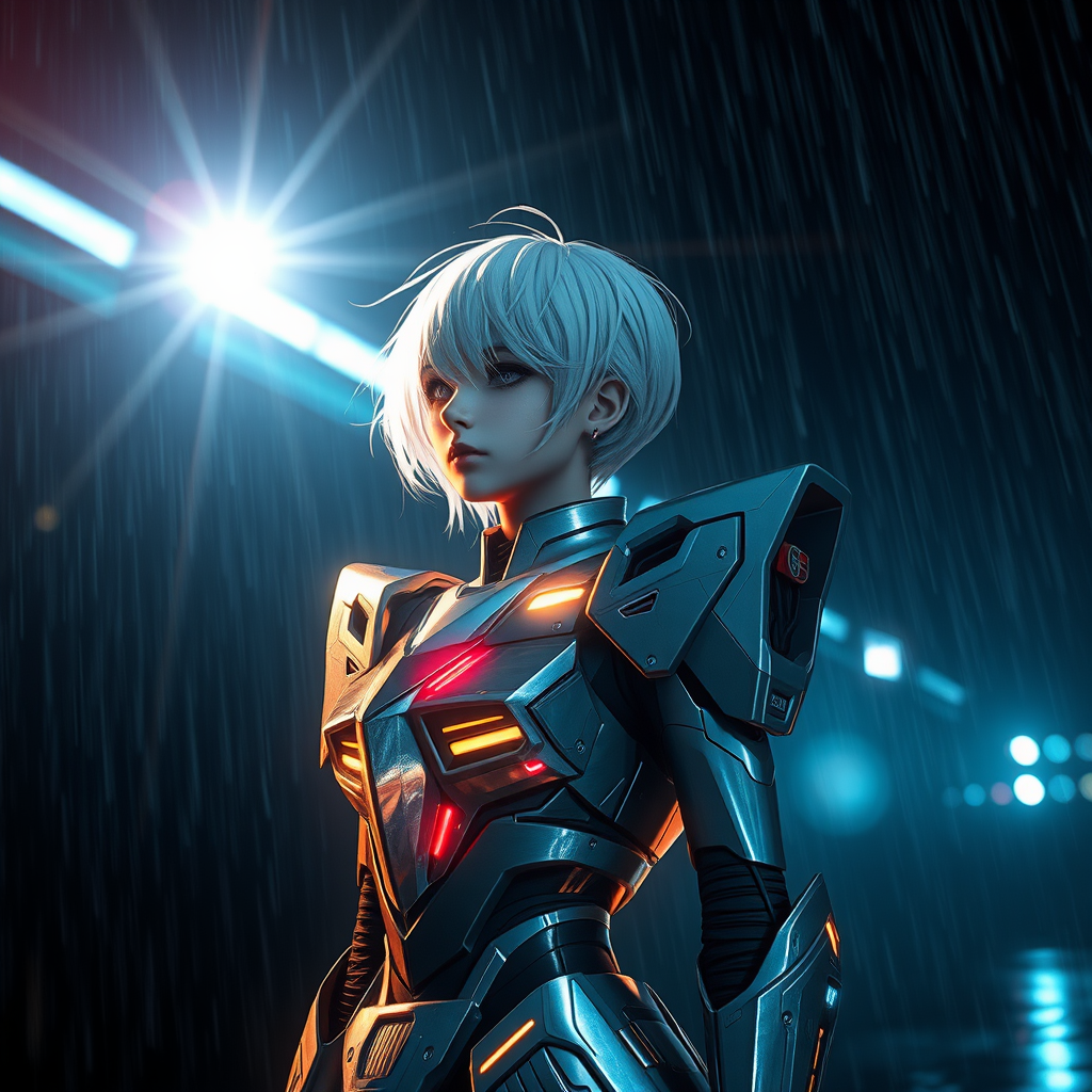 Girl in sleek Gundam-inspired armor, her short white hair swept by the wind, stands alone on a dark, rainy night. The scene is a cinematic masterpiece, trending on ArtStation for its extreme detail and surreal, divine atmosphere. The environment glows with celestial light, enhanced by manga and anime influences, with a lens flare that adds to the hyperrealistic effect. The intricate details and vibrant colors are heightened by cinematic lighting and Unreal Engine 5's cutting-edge rendering. This 3D, hyperrealism CGI image is a stunning example of photographic craftsmanship, focusing on a powerful and solitary figure in an otherworldly setting.
