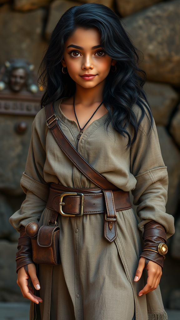 A young female adventurer with wavy black hair and a dark tan complexion stands confidently, her big brown eyes reflecting intelligence and friendliness. She wears a long, loose fantasy tunic paired with cloth tights and leather armor, emphasizing her wide hips. Her thick leather belt, adorned with many pouches, hints at her readiness for adventure. In a fantasy realm, she exudes charm and capability, her attire blending practicality with style, sans modern elements like bikinis or hoodies. The scene captures her vibrant essence without any distortions or low-quality features, set in ultra-high definition with exquisite detail in an 8K resolution. The focus remains on her dynamic presence, ensuring an immersive visual experience devoid of any distractions or technical imperfections.