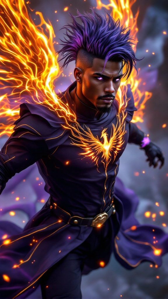 Ethereal cosmic superhero, majestic African-American male figure, 8k ultra-detailed portrait, muscular athletic build. Dynamic fade Mohawk hairstyle with obsidian waves, undercut sides, cascading front locks draping dramatically over one eye while defying gravity with ethereal flame effects, golden-orange fire wisps emanating from hair. Mesmerizing violet-amethyst eyes with luminous stellar glow, dramatic kohl eyeliner emphasizing high cheekbones and sculpted features, soul patch beneath full lips, precise thin handlebar mustache. Flowing dark violet jumpsuit with metallic chrome yellow-gold piping creating dramatic light trails, cyberpunk aesthetics, loose dramatic folds. Prominent metallic gold phoenix emblem on chest, wings spread majestically, intricate detail work. Black leather fingerless gloves with reinforced knuckles, wide black leather belt with polished gold grommets. Pleated tapered pants with neo-Tokyo streetwear influence, distressed black suede boots with decorative gold-grommet straps. Dynamic flying pose with arms extended, massive incandescent golden phoenix wings emerging from arms, trailing cosmic fire. Backlit by nebulae and spiral galaxies, dramatic rim lighting, volumetric space dust, lens flares from distant stars. Cinematic composition, dramatic angle, octane render, hyperrealistic detail, ethereal atmospheric lighting, cosmic energy effects.