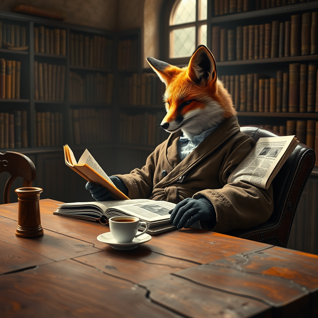 An anthropomorphic fox lounging at a rustic wooden table, absorbed in a leather-bound book, dressed in an elegant robe, with a newspaper casually set aside, savoring a portrait of morning coffee, captured in a cinematic style within a dimly lit, dusty library, bathed in the warm glow of late morning light, as if an actual snapshot from a unique moment in time.