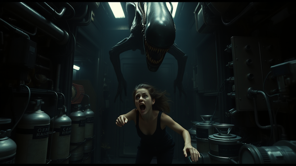 A tense and atmospheric scene reminiscent of Ridley Scott's "ALIEN" features a menacing extraterrestrial creature looming over a terrified Ellen Ripley, portrayed by Sigourney Weaver, who frantically attempts to flee from its grasp. The setting is a dimly lit, claustrophobic environment filled with industrial equipment like oxygen tanks and various metallic gadgets. The dark, shadow-laden room is captured in a wide shot, exuding raw intensity, as if taken with a Sony ALPHA 7R V camera. The scene is bathed in dramatic, cinematic lighting that enhances the filmic texture, creating a gripping, suspenseful aura.
