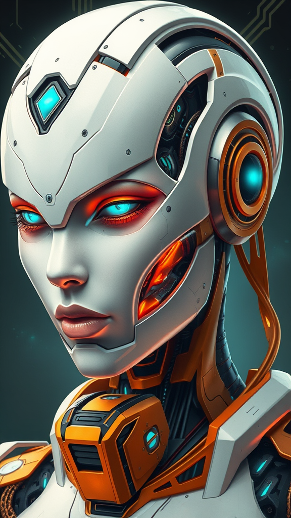 Sci-fi fantasy illustration of a stunningly beautiful robot, crafted in the style of realistic hyper-detailed portraits. The color palette features deep whites and vibrant oranges, interwoven with rich dark gold and striking aquamarine highlights. Drawing inspiration from classicist portraiture, the composition exhibits realist detail with sharply defined edges, embodying the essence of a technological marvel. The robotic figure exudes an air of elegance and sophistication, with intricate circuitry and gleaming metallic surfaces that reflect its advanced design. The overall ambiance balances the fantastical with the real, creating a mesmerizing fusion of art and technology.