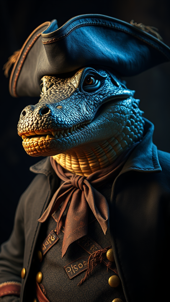 Realistic portrait of an anthropomorphic alligator dressed in elaborate 18th century pirate attire with a weathered tricorn hat, intricately patterned waistcoat, and a tattered neck tie, designed as a video game character with a rugged appearance; features realistic cinematic lighting highlighting the rough texture of its scales, creating a highly detailed portrait view in HD and 4K resolution reminiscent of HBO's dramatic style; the scene is accentuated with dramatic, moody lighting and a palette of deep, dark colors, evoking an aura of mystery and adventure.