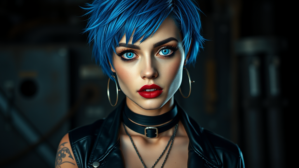 A character portrait of a woman with vivid blue, tousled short hair and multiple piercings set against a dark industrial background. Her piercing blue eyes captivate with bright, realistic eye texture, accentuated by dark makeup. Her attire features rock-inspired clothes, including a leather shirt and a black choker, enhancing her edgy look. The woman's pose exudes elegance and confidence, adorned with jewelry like earrings and a nose ring. A tattoo on her arm adds to her rebellious charm, and the detailed glow of cinematic light highlights her high-resolution features, from her intricate facial features to her expressive cartoon-style eyes. The scene brings an aesthetic balance of sharp focus and a slightly blurry backdrop, creating an immersive high-detail world reminiscent of Charlie Bowater's work, rendered with octane precision and RTX clarity. Complete with a navel-baring outfit, the portrait presents a unique fusion of rock and elegance against a rich black environment.