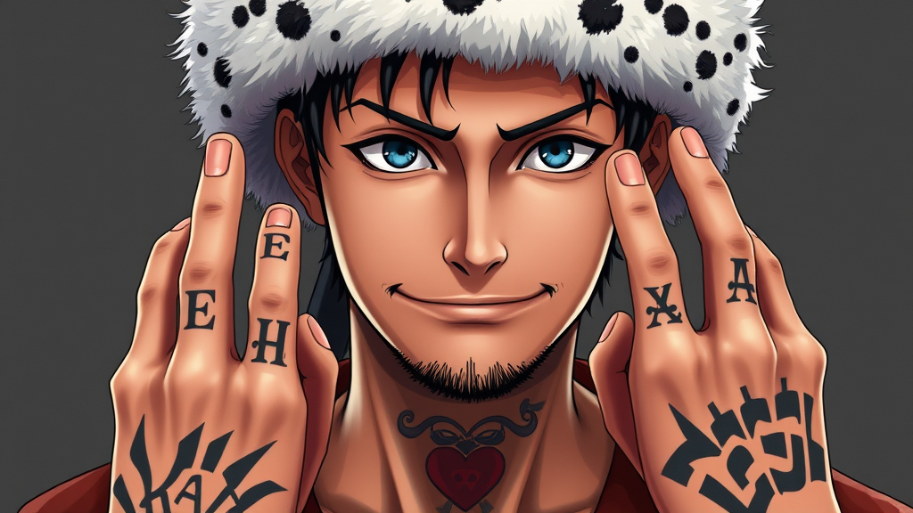 A highly detailed portrait of Trafalgar D. Water Law from the One Piece anime, depicted as an ultra-realistic, hyper-detailed, slim young man with a relatively tall stature. He sports a confident smirk, accentuated by a northern-style fur hat, predominantly white with a distinctive spotted pattern along its base and brim. His short dark hair is meticulously styled, complementing his dark sideburns and a trimmed goatee. Intriguing tattoos spell the word D E A T H in bold black letters across the back of each finger on both hands. On his chest, a tribal-style heart tattoo features his Jolly Roger emblem. The portrait is captured with cinematic lighting and high contrast, showcasing every detail in striking clarity. The overall composition presents an artist's interpretation, offering subtle creative adjustments while maintaining the essence of the character in an artstation-quality, character concept art style rendered in 8K resolution.