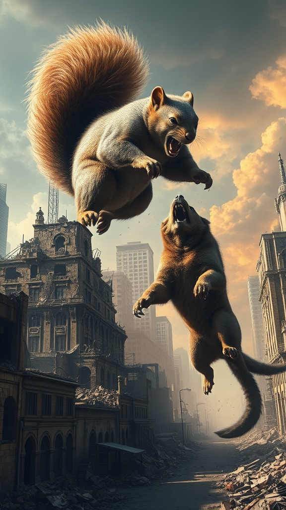 A colossal squirrel, towering over the crumbling ruins of a devastated metropolis, clashes ferociously with a massive canine adversary; their titanic struggle sends shockwaves through the shattered skyscrapers and abandoned streets, reminiscent of a King Kong vs. Godzilla showdown. The squirrel's bushy tail weaves like a living whip as it leaps from a demolished building, while the dog's growls echo like thunder, each creature embodying the primal fury of nature reclaiming the urban wasteland in an epic battle for dominance.