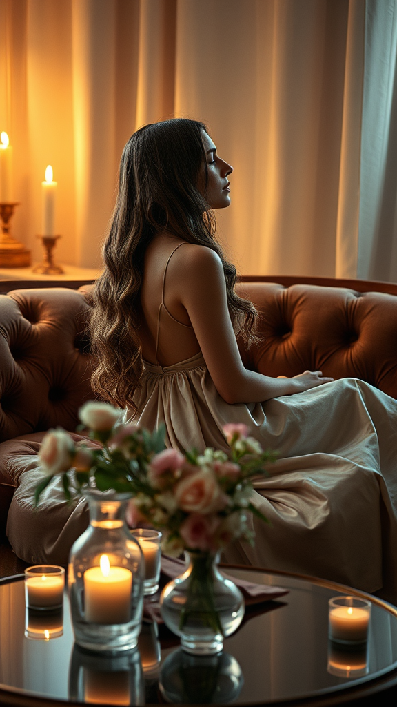 absurdres, epic composition, a stunning woman reclines on a plush velvet couch in a softly lit room, surrounded by the gentle flicker of candlelight. Her long, flowing hair drapes gracefully down her back in gentle waves, eyes serenely closed in introspective solitude. She wears an elegant silk gown that shimmers in the ambient glow. A vase filled with freshly cut flowers decorates the table before her, their scent gently perfuming the air, hiqcgbody, back_view, atmosphere, side view, artist name, ethereal, delicate ambiance, muted tones, realistic, atmospheric.