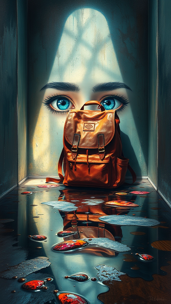 Create a vibrant oil painting featuring a school bag in a damp, dirty environment, incorporating elements of water, reflections, and refraction through mirrors and prisms. Capture sunlight and glowing lights with intricate, elegant detail, ensuring high contrast and sharp focus. Illustrate eyes reflecting into eyes, creating an infinite loop, embodying a photorealistic style inspired by artists like Ed Blinkey, Atey Ghailan, Studio Ghibli, Jeremy Mann, Greg Manchess, Antonio Moro, and Alphonse Mucha. The artwork should be dramatic and trending on platforms like ArtStation and CGSociety. Avoid unrealistic elements such as extra limbs, poorly drawn features, or disfigured anatomy.