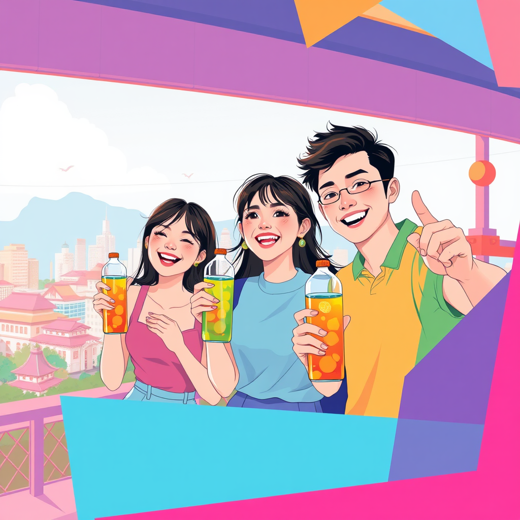 A vibrant and dynamic illustration showcasing three cheerful Asian friends—two women and one man—enjoying refreshing beverages from PET bottles. Positioned in the bottom right corner, they are surrounded by a lively and colorful backdrop, emphasizing a panoramic view. The composition is executed in a minimalist vector style, capturing high resolution and intricate details, while infusing a touch of playful abstraction with soft pastel colors and geometric shapes that add a whimsical atmosphere.