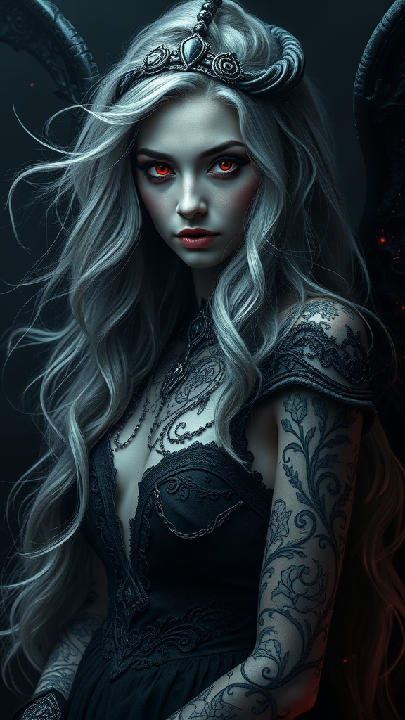 A full body portrait of a dark queen exuding a mystical, dark fantasy aura with an underworld theme, rendered as a deviant art masterpiece. She possesses mesmerizing crimson eyes and flowing grey hair, wearing an intricately designed dark dress that complements her enigmatic presence. Her skin is adorned with intricate dark tattoos, enhancing her mysterious allure. The color grading emphasizes the haunting beauty of the scene, offering a dark illustration with 8k cinematic quality. Subtle ethereal elements dance around her, adding depth to her otherworldly domain.