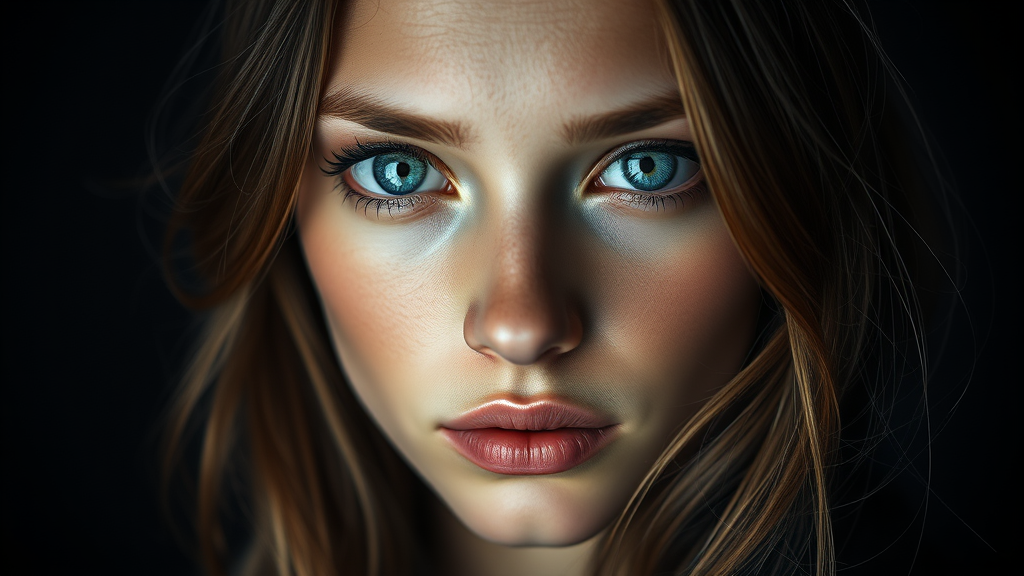 A meticulously detailed studio full body portrait of an intricately detailed young woman with striking ice-blue eyes, captured in dim lighting. This ultra-realistic, hyper-detailed photograph is shot on a Leica SL2 with a 105mm lens at f/5, showcasing the exquisite craftsmanship reminiscent of Irving Penn and Annie Leibovitz, and expertly retouched by Pratik Naik. The ambiance conveys a sense of ethereal elegance and intriguing mystique, with subtle creative flourishes enhancing the original vision.