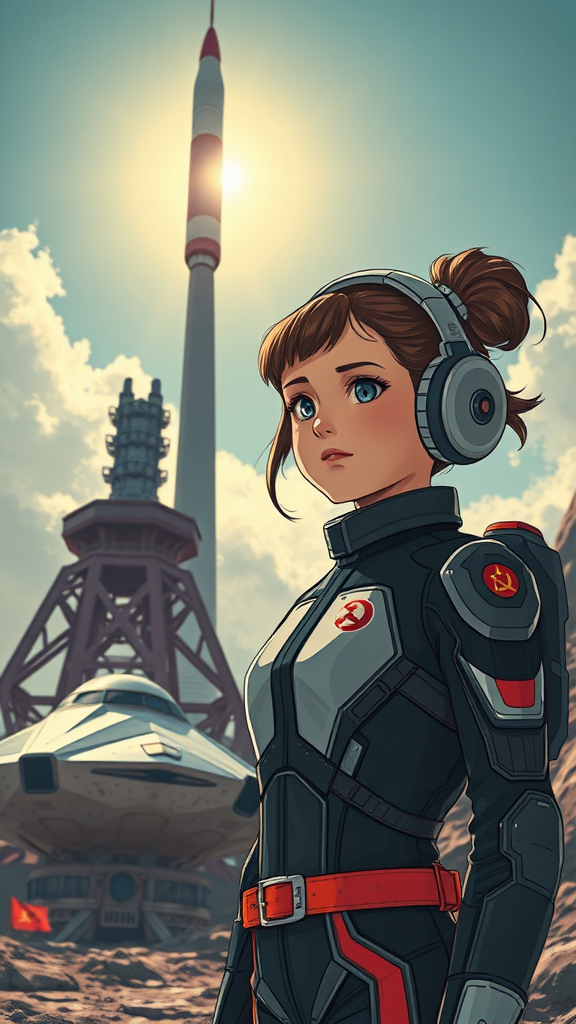 Young girl in a futuristic sci-fi suit with a retro Soviet aesthetic, styled like a USSR propaganda poster. A towering rocket stands in the background, with a sleek spaceship nearby under a bright, sunny sky. Influenced by anime and manga graphics, the scene is rendered in dark, rich colors with a high level of detail, reminiscent of offset printing. The poster conveys a sense of optimism and excitement, captured in 8K HD with natural lighting, emphasizing a cheerful atmosphere and a high-definition CMYK finish.