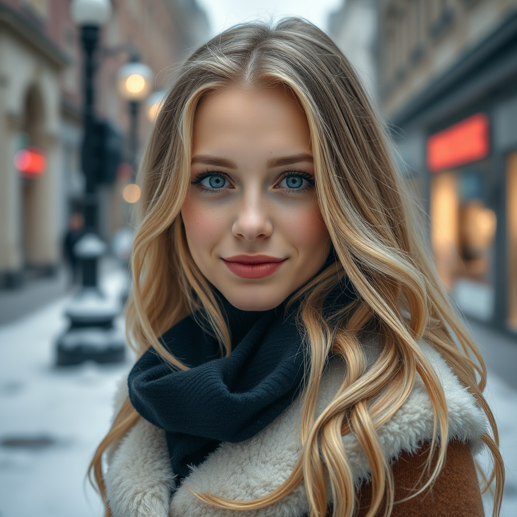 A professional portrait of a stunning Norwegian girl in winter attire, with long, wavy blonde hair and a playful expression. Her face is symmetrical, adorned with freckles and subtle natural makeup, set against a snowy city street backdrop. The scene captures an elegant, modern urban environment with a highly detailed and intricate composition. The image is in sharp focus with a beautifully executed depth of field, shot at f/1.8 using an 85mm lens for a medium, centered frame. The color grading is professional, with soft, diffused light and hints of volumetric fog creating a dreamy atmosphere. The portrait is trending on social platforms like Instagram and Tumblr, presented in vibrant HDR quality in 4k and 8k resolution.