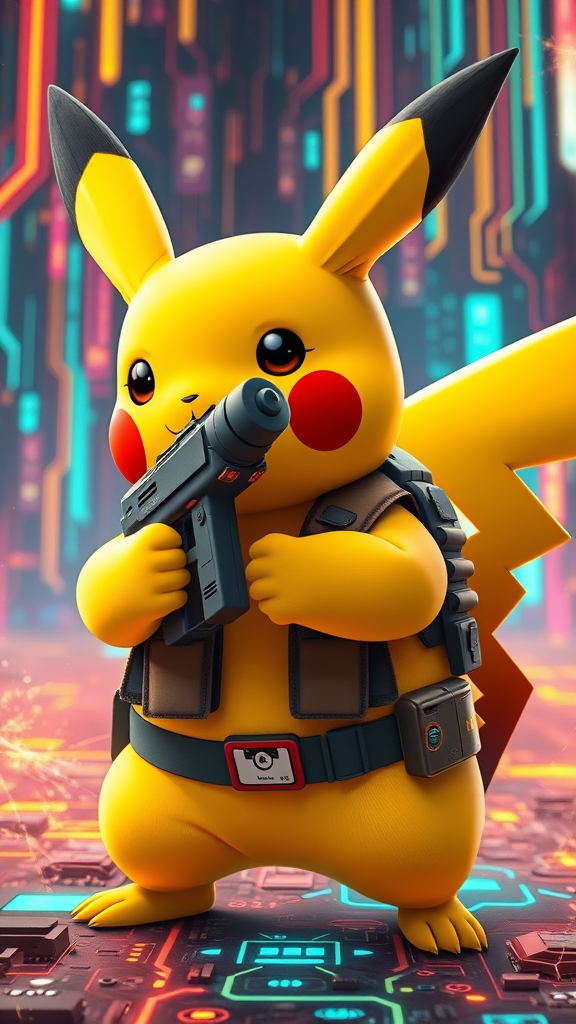Pikachu in a tactical vest, confidently holding a futuristic-looking blaster in its paws, surrounded by a brightly colored digital landscape filled with circuits and electric sparks.