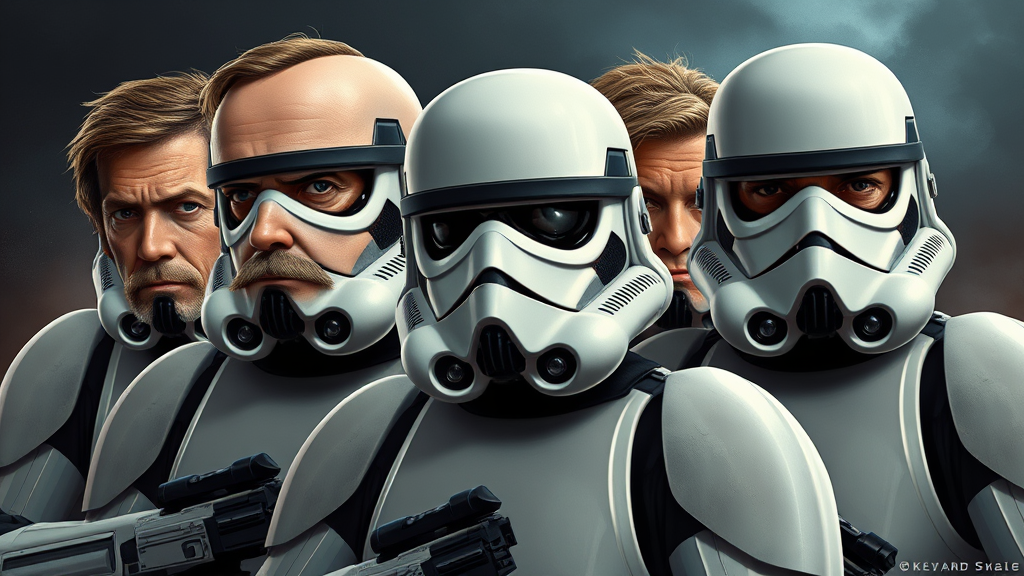 A whimsical and imaginative digital art piece depicting Hollywood celebrities reimagined as stormtroopers, donning the classic Star Wars armor. Notable actors and actresses are instantly recognizable by their distinct facial features and signature expressions. Set against a moody and atmospheric backdrop, the composition blends humor and satire with elements of geek culture, incorporating subtle hints of sci-fi gadgetry and iconic movie references, creating a playful homage to cinema and pop culture.