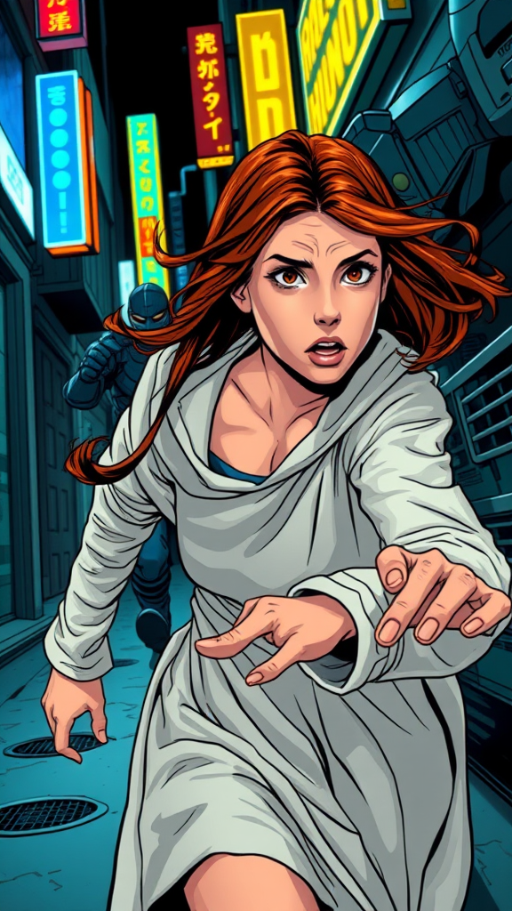 Close up image of two subjects, a girl with auburn hair in a long-sleeve white dress with a hood, her expression terrified as she runs for her life, pursued by a man in futuristic armor, his hand reaching out to grab her, set in a gritty city alley, glowing with blue and yellow neon signs, a high-intensity chase scene unfolds, crafted in a vibrant comic book style, detailed with thick outlines, shot from a dramatic camera angle, featuring realistic skin tones and impeccably detailed hands, dynamic action lines and motion blur enhancing the sense of speed and urgency in this futuristic urban escape.
