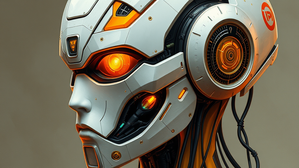 Sci-fi fantasy illustration featuring an exquisite robot, styled in realistic hyper-detailed portraiture, blending dark white and vibrant orange tones, reminiscent of classicist portraiture. The composition incorporates dark gold and aquamarine hues, showcasing intricate realist details and hard edges. This technological marvel is set against a backdrop that accentuates its futuristic elegance, capturing the essence of advanced innovation and artistry.