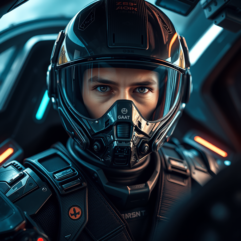 Hyperrealistic detailed portrait of a pilot wearing a futuristic full-face helmet, seated in a high-tech cockpit, adorned in sci-fi armor, gazing directly at the viewer. The scene has cyberpunk elements with glowing bioluminescent accents, capturing a cinematic essence with sharp focus and depth of field. Dramatic lighting highlights the intricate details of the armor and the technological design of the cockpit, creating an immersive and visually striking atmosphere.