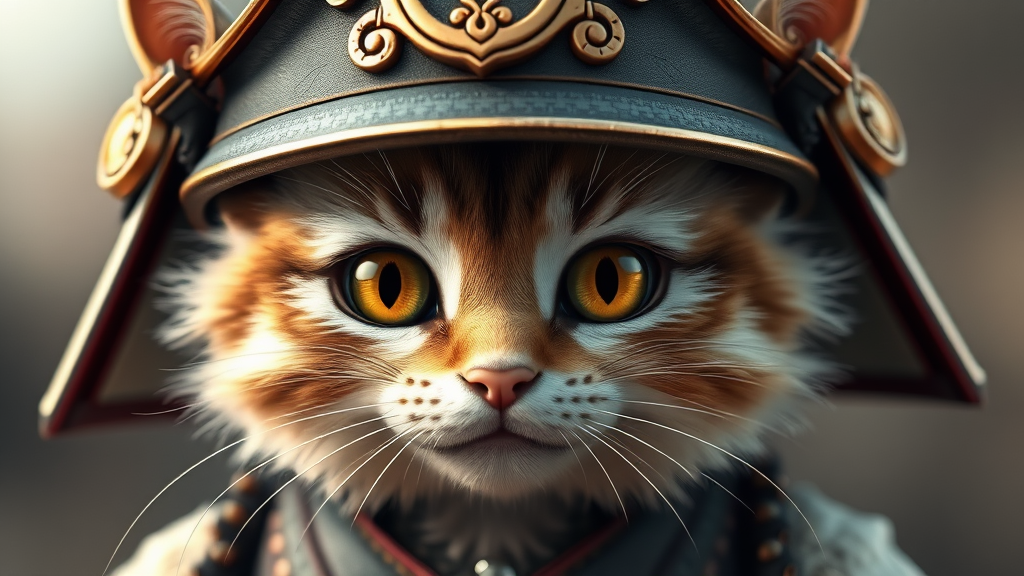 A whimsical 3D-rendered portrait of a feline samurai, featuring a close-up of a cat adorned with an intricately detailed helmet. The cat's fur glistens softly, capturing a playful yet noble expression. Its eyes, bright and curious, peek from beneath the helmet, lending a sense of charm and wisdom. The helmet is adorned with subtle engravings and decorative elements, blending traditional samurai aesthetics with a cute, imaginative twist. The background is softly blurred to keep the focus on the cat's captivating persona.