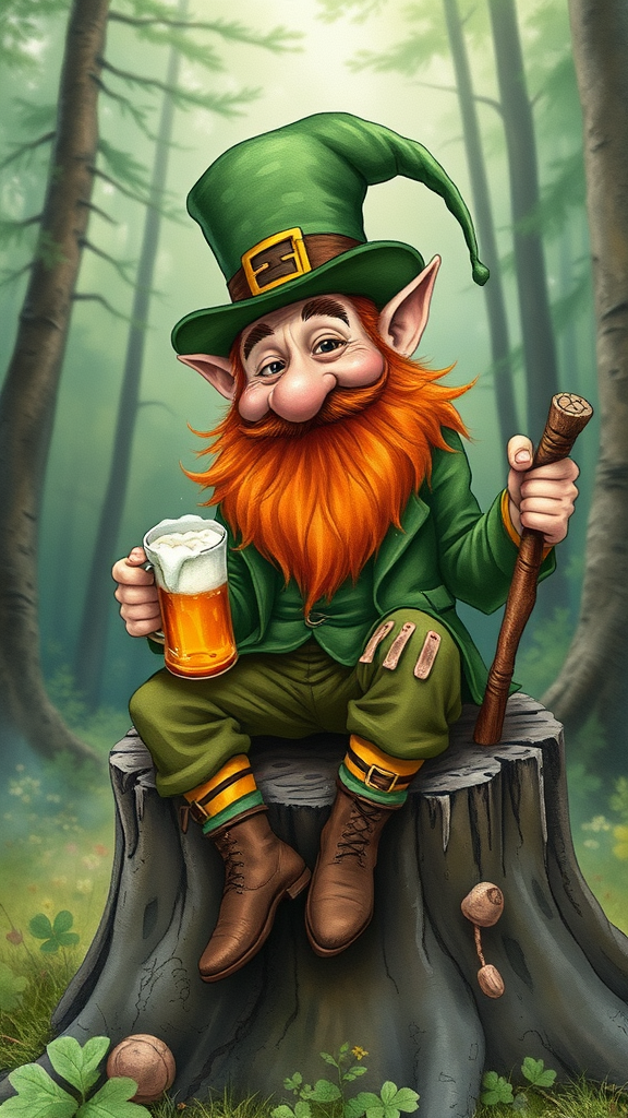 A quirky leprechaun with a scruffy red beard, wearing a tattered green suit, clutches a frothy mug of beer in one hand while amusingly swatting himself with a gnarled stick in the other. Seated on a worn stump amidst a lush forest, this image is a whimsical watercolor illustration reminiscent of Herluf Bidstrup's style. Celebrate a peculiar St. Patrick's Day with a touch of Weird Al Yankovic’s humor set in a nostalgic, grainy photograph from the mid-2000s. The scene is captured with hyper-realistic detail, showcasing the leprechaun’s expressive face and mischievous demeanor, crafted as a digital masterpiece, making waves on artstation. A blend of headshot and body shot, revealing every intricate detail of his playful face.