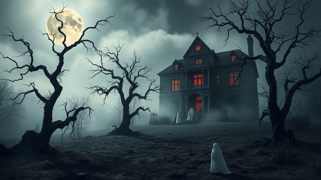 A hauntingly eerie landscape under a full moon, shrouded in mist with twisted, gnarled trees reaching towards the sky. Shadows dance across the ground as a cold, spectral wind sweeps through, carrying with it distant whispering echoes. A dilapidated, ancient mansion looms in the background, its windows glowing dimly with an ominous, crimson light. Ghostly figures waver near the entrance, casting unsettling silhouettes against the moonlit fog.