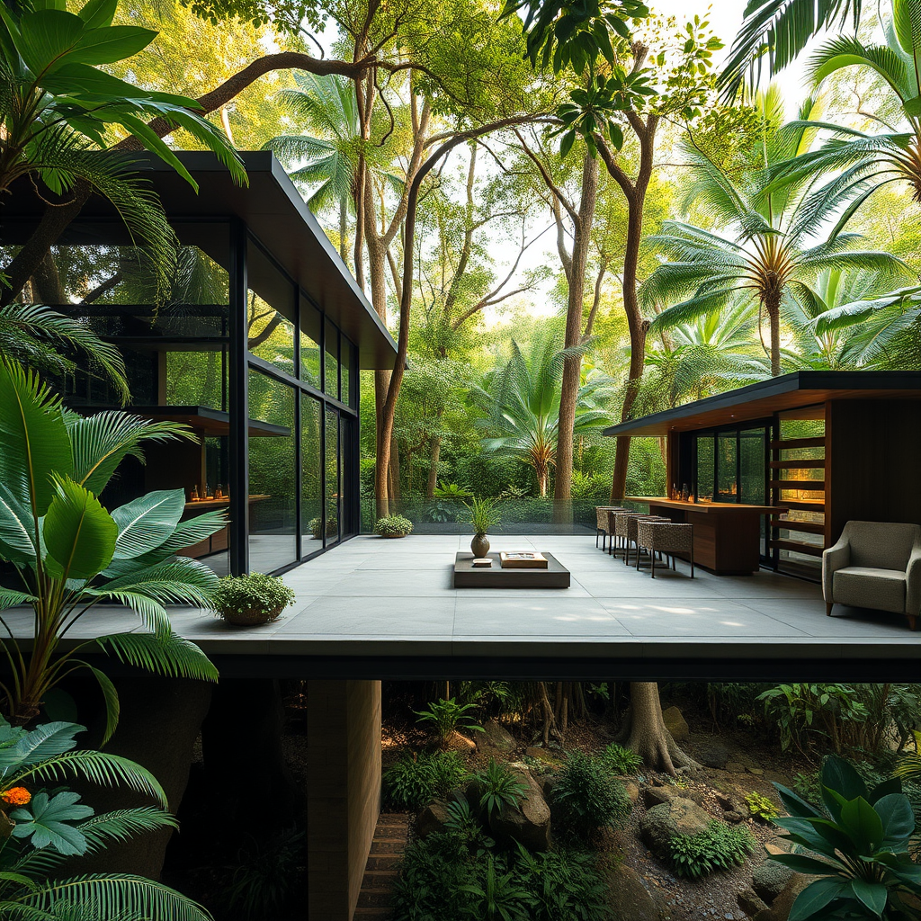 A stunning abode showcasing tropical modernism nestled within a lush forest, featuring sleek architectural lines blended harmoniously with nature. Large glass walls invite the surrounding greenery inside, while a cantilevered terrace overlooks the vibrant landscape. Soft, volumetric lighting filters through the canopy, casting dappled patterns on the natural stone and wood finishes. The design is a serene retreat, offering a seamless connection between the indoor and outdoor environments.