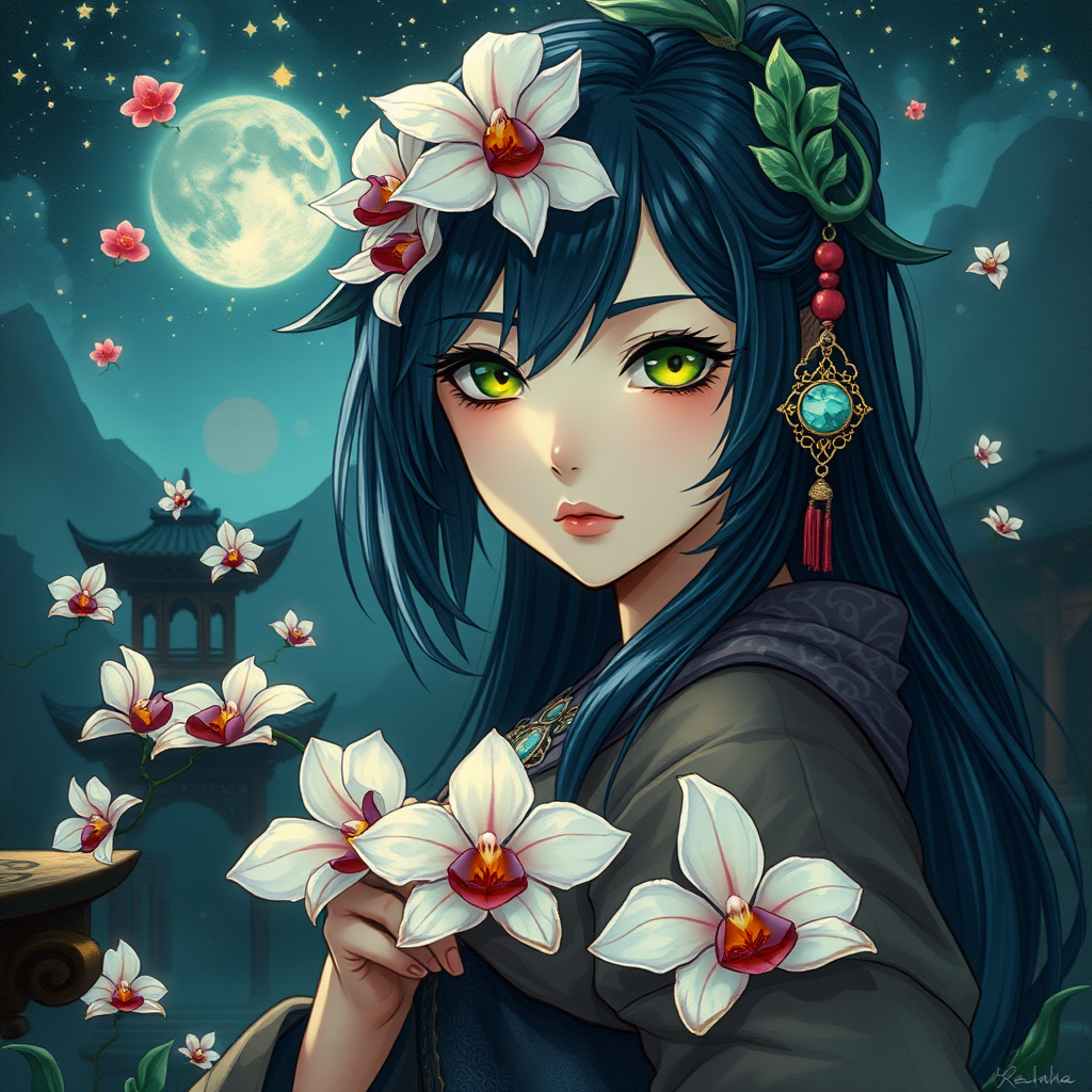 A mysterious anime sorcerer from the Tang dynasty adorned with an orchid hair accessory and jade charm amid the midnight aura of an ancient temple. Her emerald green eyes contrast with midnight blue hair and a celestial star ornament, set against a mystical landscape. Inspired by the style of Kay Nielsen, she wears flowing robes and holds a captivating gaze towards the viewer in a wide angle portrait. The mystical lighting casts an otherworldly glow, resembling a cascade of constellations. Orchid blossoms drift like enchanted sparks around her, and the scene is rendered in mixed media with a touch of expressive style.