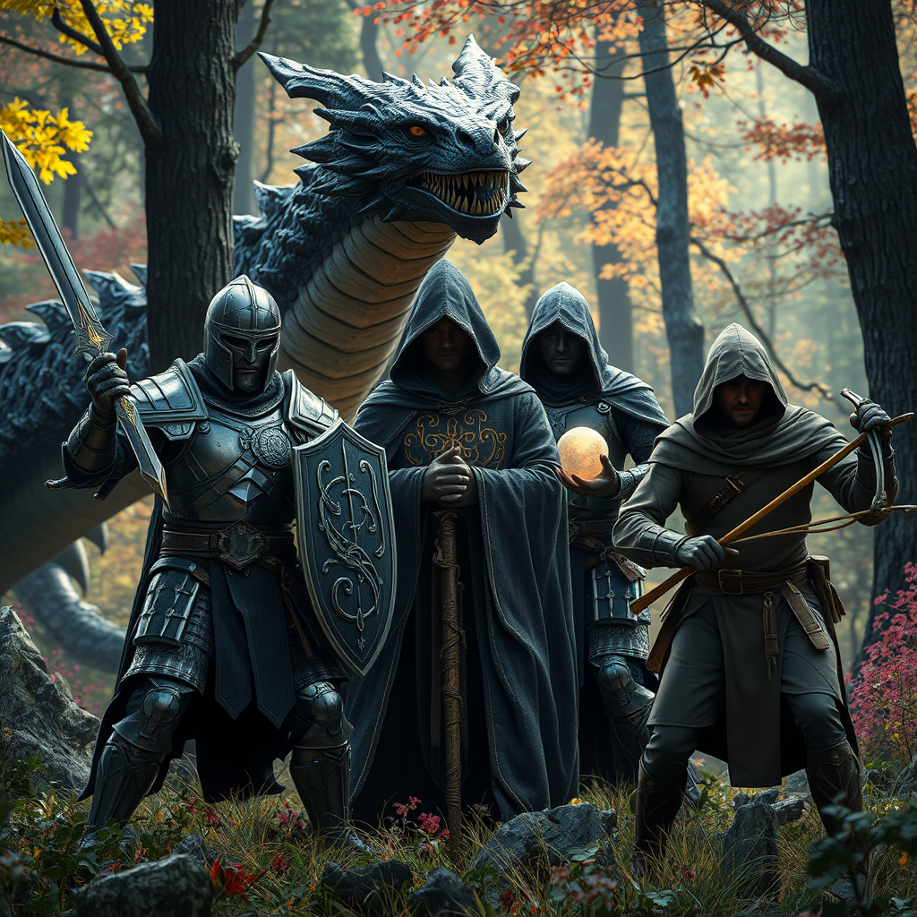 A cinematic and photorealistic image captures an epic fantasy battle scene set in a vibrant yet slightly muted forest. The focus is on a paladin dressed in intricately detailed armor, wielding a subtly glowing sword and shield. Beside him stands a mysterious wizard shrouded in a hooded robe, adorned with complex arcane symbols that weave across the fabric, holding a staff topped with a gently luminescent orb. The wizard's face remains hidden by the shadows of the hood. To their other side, a ranger is seen wearing a finely crafted leather cloak, skillfully poised with a longbow. They confront a formidable three-headed dragon, its scales textured richly yet with subdued colors. The forest's lighting is sharp and pristine, emphasizing the crisp details of both characters and surroundings, while maintaining natural, understated hues.
