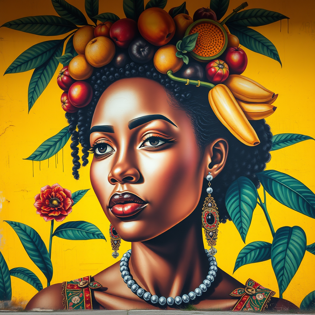 A vibrant mural of a woman on a golden-yellow wall, adorned with a crown of exotic fruits, blending the intricate style of Ingrid Baars with the detail of Benin art. The scene is enriched with elements of cultural melting pots and pays homage to the lush compositions of Paolo Veronese, rendered in stunning 32k UHD clarity. This commissioned piece seamlessly integrates chiaroscuro portraiture, capturing the dynamic play of light and shadow.