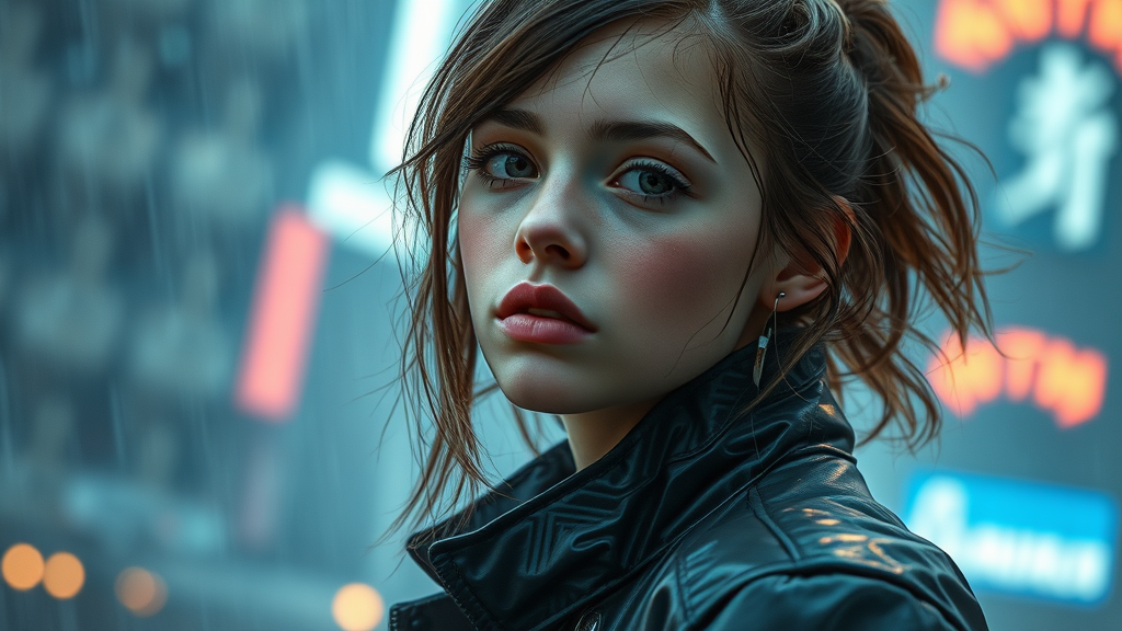 Portrait of a young European girl in a storm wearing a futuristic sci-fi movie jacket, blending royal and cyberpunk aesthetics, with influences from Ismail Inceoglu, Dragan Bibin, Hans Thoma, and Greg Rutkowski. Her attire reflects a neotokyo vibe with synthwave elements, featuring low-emission neon highlights reminiscent of a Blade Runner scene. Her face is portrayed with perfect proportions, sharp chin, and fine details, ensuring a realistic and pretty appearance. The portrait is set against a backdrop evoking a 3D cinematic feel, with a focus on maintaining a harmonious and balanced design, free from distortions and anomalies associated with low-quality images. Fusion of past and future fashion elements creates a striking visual narrative, emphasizing elegance amidst chaos.