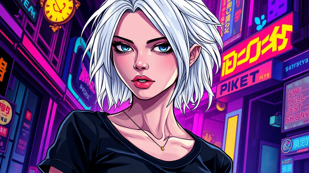Illustration of a woman with striking white hair, donning a sleek black t-shirt, depicted in a vibrant fusion of colorful fantasy and cyberpunk manga styles. The scene is enriched with elements reminiscent of Hans Zatzka's intricate details, the bold aesthetics of Marvel comics, and the expressive flair of Yanjun Cheng. The composition radiates with the luminous quality of stained-glass art and the dynamic storytelling of a colorful muralist, set with an aspect ratio of 7:9, infusing the image with a captivating narrative depth.