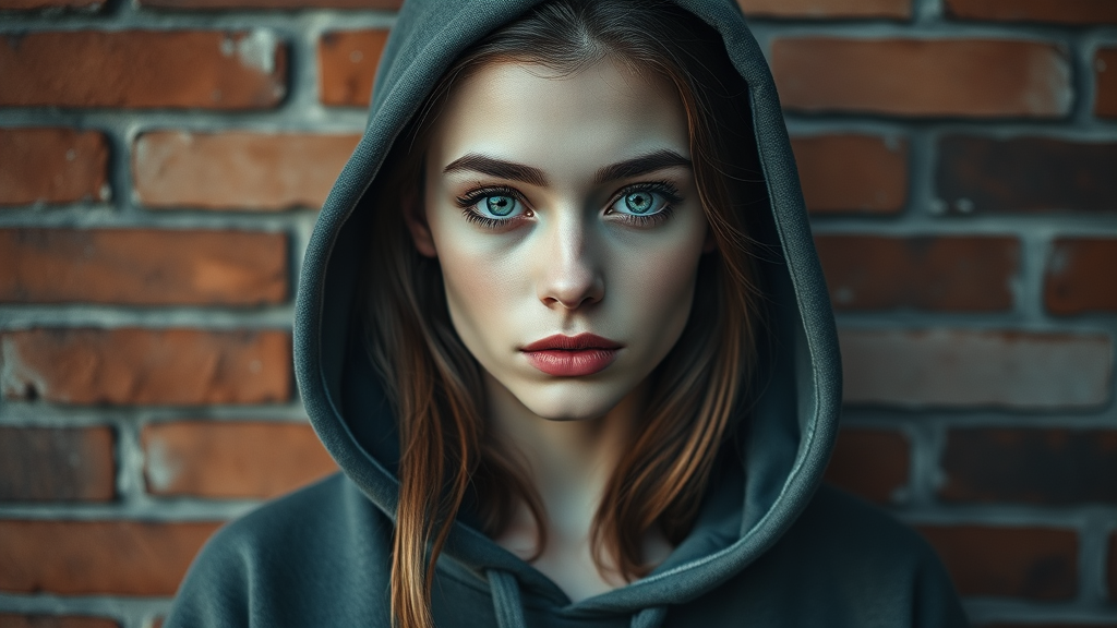 RAW photo, stunning girl in a hoodie against a brick wall, hyperdetailed photography with soft and natural lighting, high detail and sharp focus, trending aesthetic on ArtStation and Pixiv, 8k UHD from a DSLR camera, showcasing intricate details and high quality visual texture. Elements of surrealism with exaggerated proportions, unique symmetry, and imaginative mutations. A blend of realistic and abstract, featuring elongated features, subtle color dynamics, and gentle shading that plays with the concept of beauty and distortion. Enhances the allure with unexpected digital embellishments, creating a captivating yet unconventional portrait.