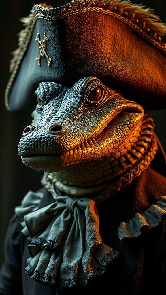 Realistic portrait of an anthropomorphic alligator wearing elaborate 18th century pirate attire, complete with a ruffled neck tie; designed as a video game character with realistic cinematic lighting; showcasing an intricately detailed face and texture; in full HD and 4K quality reminiscent of an HBO production; enhanced by dramatic lighting and a cinematic ambiance in dark and moody colors; the alligator's eyes glint with a mischievous gleam, and its ornate pirate hat is adorned with weathered gold trimmings, adding a unique twist to its pirate persona while maintaining an air of swashbuckling adventure.