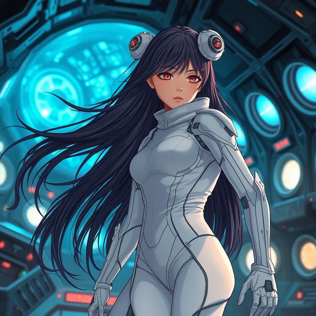 Tsutomu Nihei inspired, young girl in a white tight sci-fi jumpsuit, cyberpunk, long flowing hair, sci-fi spaceship interior, cold and distant expression, hair swirling in a gloomy cold room, rich graphics, anime influence, gigantism aesthetic, muted tones, blue luminescence with a bright angle, intricate details, sharp architectural angles, multi-tiered space, crisp shadows, blurred futuristic background, hyper-detailed sci-fi setting, energy clusters, sudden light flashes, third-person perspective, rounded illumination, circular motifs, hints of red, abstract and surreal forms, anatomical distortions, folded body, dual heads, totemic features, duality of form, grotesque anatomy, extra limbs, severed and floating elements, blurry and mutated imagery, gross and malformed proportions, otherworldly aesthetics, cloudy eyes, lifeless expressions, overwhelming light, and circular windows.