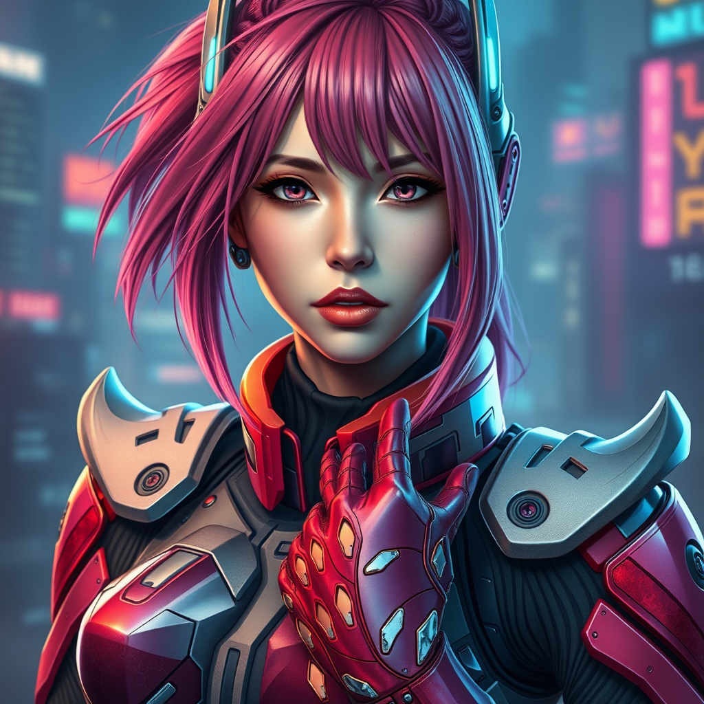 Photorealistic, stunning portrait of Asuka Langley in futuristic sci-fi armor, intricate details, vibrant colors, dynamic pose, cinematic lighting, hyper-realistic texture, background with a hint of neon cityscape, expressive eyes, emphasizing strength and elegance, balanced composition, atmospheric elements, capturing a moment of intense focus and determination.