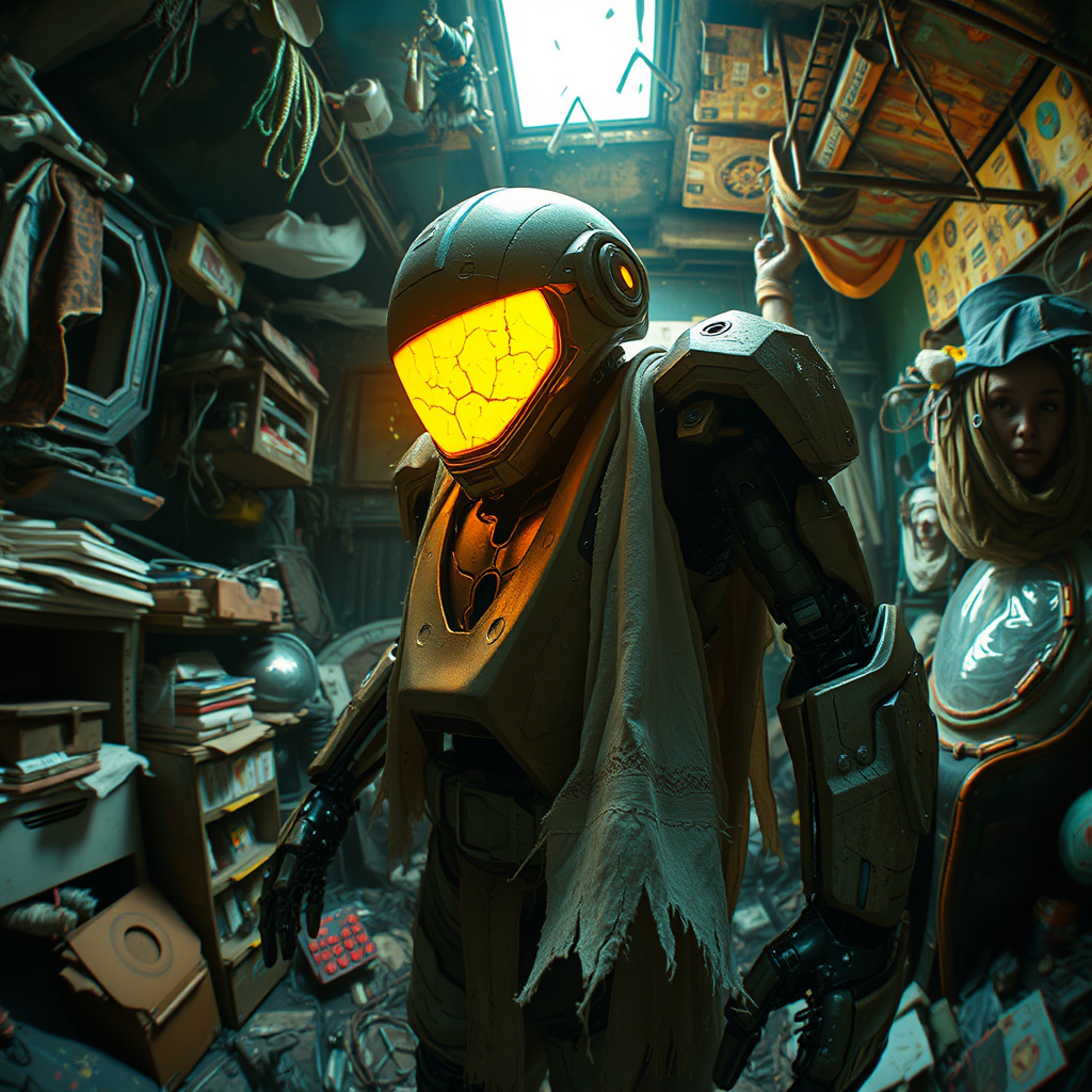 Wide angle environmental shot in a cluttered and chaotic shack, action shot, torn fabric hanging loosely, porcelain-cracked skin, inspired by League of Legends, vibrantly photo-realistic, dramatic, dark, sharp focus, 8k. Robot shattered into fragments with a glowing yellow visor as a futuristic sci-fi cyberpunk knight, medium shot, intricately designed, unreal engine, warm indoor lighting, detailed like on artstation, cinematic lighting, vibrant natural elements, inspired by James Gurney, Katsuhiro Otomo, and James Paick. Heavily influenced by Craig Mullins, Greg Rutkowski, Pete Morbacher, and Tuomas Korpi, capturing the spirit of Tekkon Kinkreet. Featuring volumetric light, trending on artstation, sharp focus, studio photo quality, highly detailed, evocative of Greg Rutkowski's artistry.