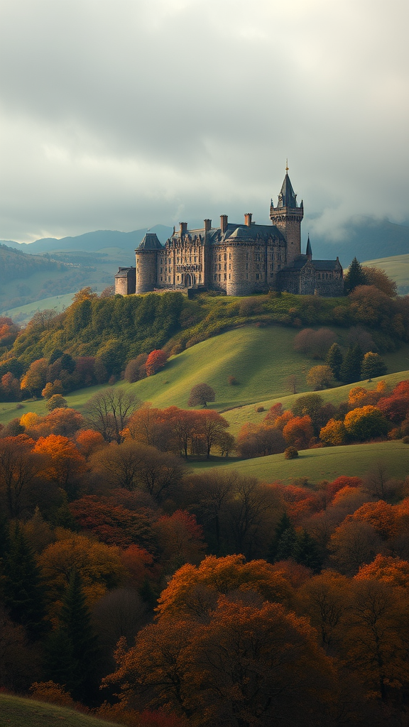 majestic medieval countryside featuring a grand English castle on the horizon, shrouded in a misty atmosphere, hyper realistic detail, 8k resolution, sweeping and epic composition, cinematic feel, vibrant autumn colors, rendered in octane for a rich, immersive quality, capturing the serene beauty of rolling hills and lush valleys, artstation-worthy landscape with inspiration from the photography of Carr Clifton