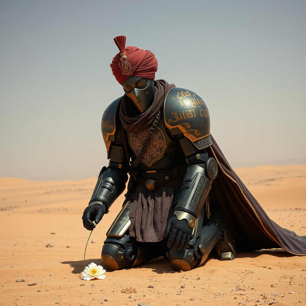 A 19th-century Sikh king majestically wearing a turban and a futuristic Japanese mecha exoskeleton Gundam warhammer suit, adorned with a long, heavy cape. The carbon fiber exoskeleton is intricately engraved with golden Punjabi script that imbues the suit with mystical powers. In a scene akin to Billelis art, his face is shielded by a metallic cover. Positioned centrally within the frame, the king is captured in a serene kneeling position, delicately picking up a flower from the desolate desert floor. The suit is crafted from neo-futuristic technology, seamlessly merging elements of modern history with advanced innovation, set against an endless expanse of barren desert under natural daylight. The setting is imbued with a calm and peaceful atmosphere, replete with subtle, blink-and-miss details. Inspired by the cinematic brilliance of Akira and Star Wars, and art styles reminiscent of Akira Kurosawa, Norman Rockwell, Syd Mead, Boris Vallejo, Jean Giraud Moebius, John Berkey, Eugène Delacroix, and Rembrandt Van Rijn, the scene is meticulously detailed, blending romanticism with a vision of a neo-futuristic realm.