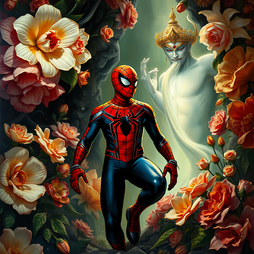 A captivating portrait of Spider-Man traversing the underworld, encircled by a regal assortment of flowers in bloom, each petal reflecting the intricate elegance of a rococo aesthetic. Nearby, a mystical genie emanates a luminous glow that contrasts with the somber shadows, creating a dramatic Rembrandt-style interplay of light and dark. In the midst of this ethereal scene stands Tom, a figure exuding modern charm and style, grounding the composition with contemporary art influences. The entire tableau is painted in hyper-realistic detail, merging the fantastical elements with lifelike precision, inviting viewers to lose themselves in this richly layered, otherworldly narrative.