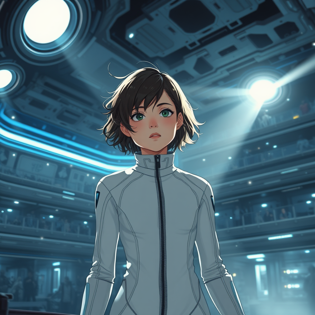 In a Tsutomu Nihei-inspired futuristic world, a young girl dons a sleek, white sci-fi jumpsuit. Her hair, stylized and slightly whimsical, flutters lightly in the chilling breeze of the spaceship interior. The room is characterized by a somber, cold ambiance, with muted colors and an intricate play of shadow and light. Blue luminescence emanates softly, contrasting with a striking bright light from an angle, creating sharp angles and a complex interplay of shadows. The expansive multi-storey space is a testament to sci-fi gigantism, detailed with numerous subtle elements and sharp edges. A third-person perspective captures the scene where she stands in a futuristic setting, her expression cold and distant amidst a backdrop of blurry multitudes. Clumps of energy and flashes of light sporadically illuminate the environment, enhancing the otherworldly atmosphere. Circular motifs and elements punctuate the space, adding to the round illumination that softly highlights her presence. Her portrayal hints at deformities, with distorted features, disfigured anatomy, and unsettling symmetry that invade the composition. Elements of mutation and grotesque proportions blend seamlessly into the ensemble, incorporating duplicated faces and malformed limbs. The form is partly blurred, as some limbs appear disjointed or misplaced, invoking a sense of surrealism and distortion. Further complexity arises from the surreal anatomy, where a myriad of perspectives and deformations echo a sense of distortion. The blend of natural light with blinding artificial sources creates a dramatic, almost ethereal atmosphere, accentuated by the interplay of larger-than-life elements with the intimate bleakness of her expression. The scene feels trapped in a state of perpetual flux, with the conventional boundaries of form and space blurring together into a disconcerting yet fascinating futuristic tableau.