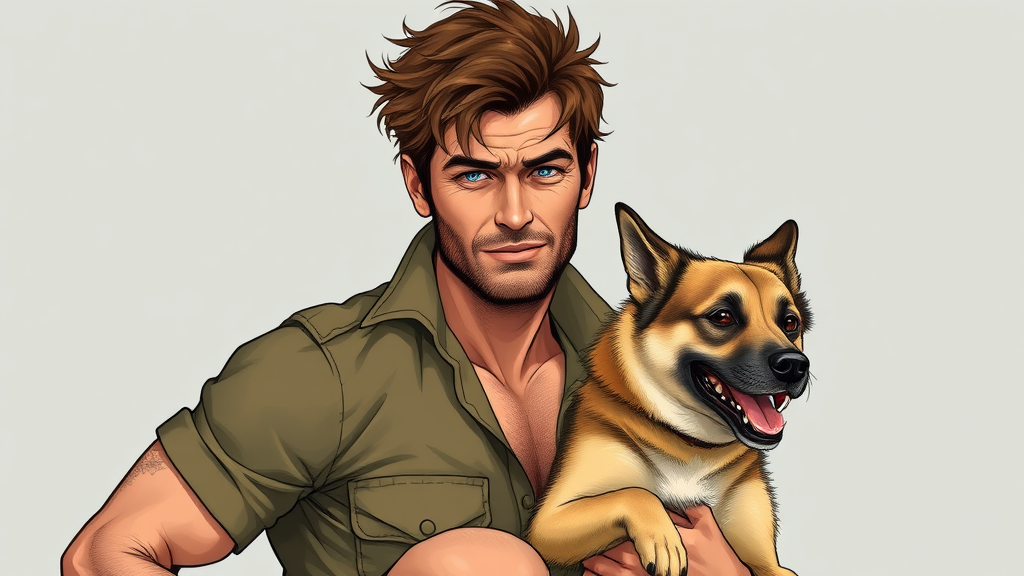 Create a striking, realistic illustration for a men's phone case, featuring an Australian man with his dog. The character should embody the rugged, adventurous spirit of Australia, showcasing a sense of strength, loyalty, and connection to the outdoors. The man is in his late 20s to early 30s, with a strong, athletic build. His skin is sun-kissed and weathered from outdoor adventures. His face is rugged, with a strong jawline, light stubble, and piercing blue eyes that exude confidence and warmth. His hair is short and messy, slightly tousled by the wind, with natural brown highlights. He should have an expression of calm strength, with a slight smile or smirk, and a posture that conveys ease and readiness for any challenge. He is wearing a casual, practical outfit for outdoor activities: an olive-green, short-sleeve shirt with sleeves rolled up to expose his muscular forearms. His khaki cargo shorts are weathered, indicating regular use, with small rips or dirt marks that show his active lifestyle. His sturdy boots, worn but reliable, are perfect for hiking, and a brown leather belt holds a multi-tool and a flashlight, signaling his preparedness for adventure. The man is standing tall and relaxed, one hand gently resting on the back of his dog, showcasing the deep bond between them. His other hand hangs by his side or slightly raised as if ready for action. His posture is confident yet approachable, giving off an aura of strength and security. The dog is an Australian Kelpie, sleek and agile, with a glossy black and tan coat that shines under natural light. Its ears are upright, and its eyes are bright and alert, filled with intelligence and loyalty. The Kelpie should stand at the man’s side, slightly leaning towards him, with its tail slightly raised in excitement or alertness. Its athletic build and energetic stance emphasize the dog’s agility, complementing the man’s ruggedness. The background should remain minimalistic with a pure white color to ensure focus on the character and the dog, with subtle hints of the Australian outback like a blurred silhouette of the red earth, sparse trees, or distant mountains, but not overpowering the characters. Natural, warm lighting should illuminate the character and dog, enhancing their features. Use earthy tones like deep greens, browns, and sandy yellows to highlight the textures of the man’s clothing and the dog’s fur. The lighting should create soft shadows that emphasize the muscular build of the man and the sleekness of the dog’s coat. The design should convey a sense of adventure, strength, and companionship. The man and his dog should appear as an inseparable team, ready to take on any challenge in the rugged Australian wilderness, evoking feelings of loyalty, courage, and connection to nature. The design will appeal to men who love adventure, the outdoors, and the Australian way of life, making it a perfect fit for a phone case that stands out with a unique, rugged Australian vibe.